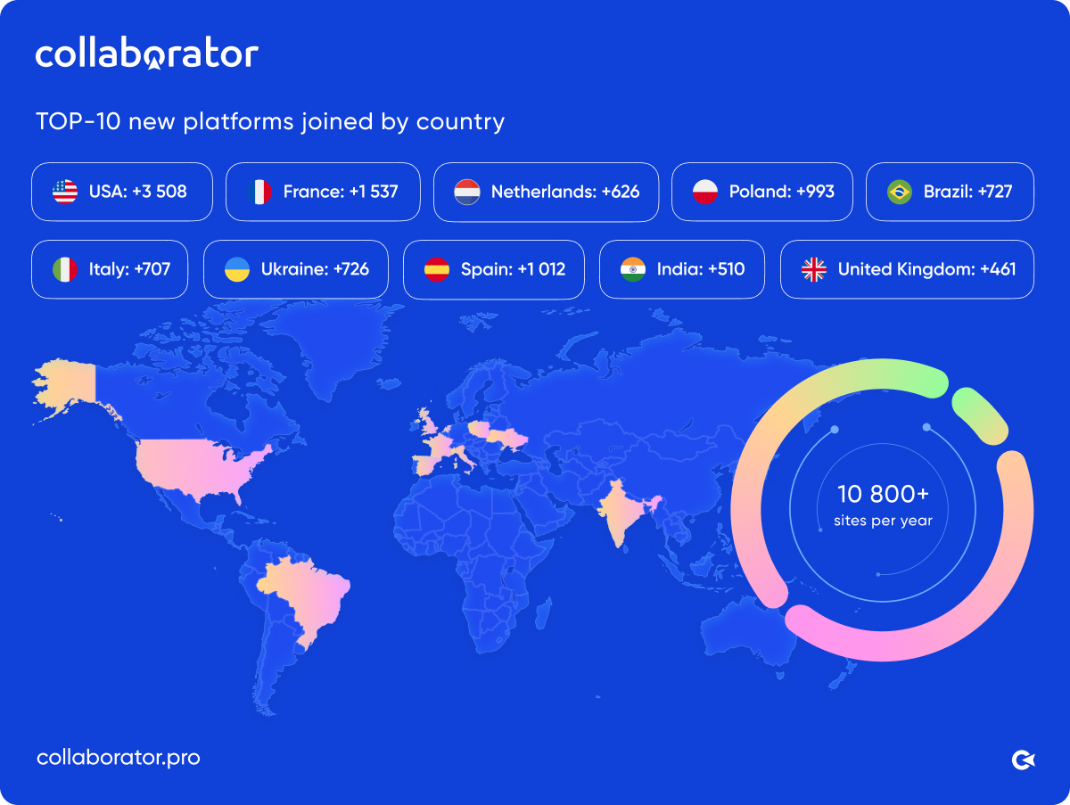This year, our catalog expanded significantly, not just in size, but in global coverage. Thousands of new platforms joined Collaborator, with verified and active websites now representing over 150 countries and 50+ languages.